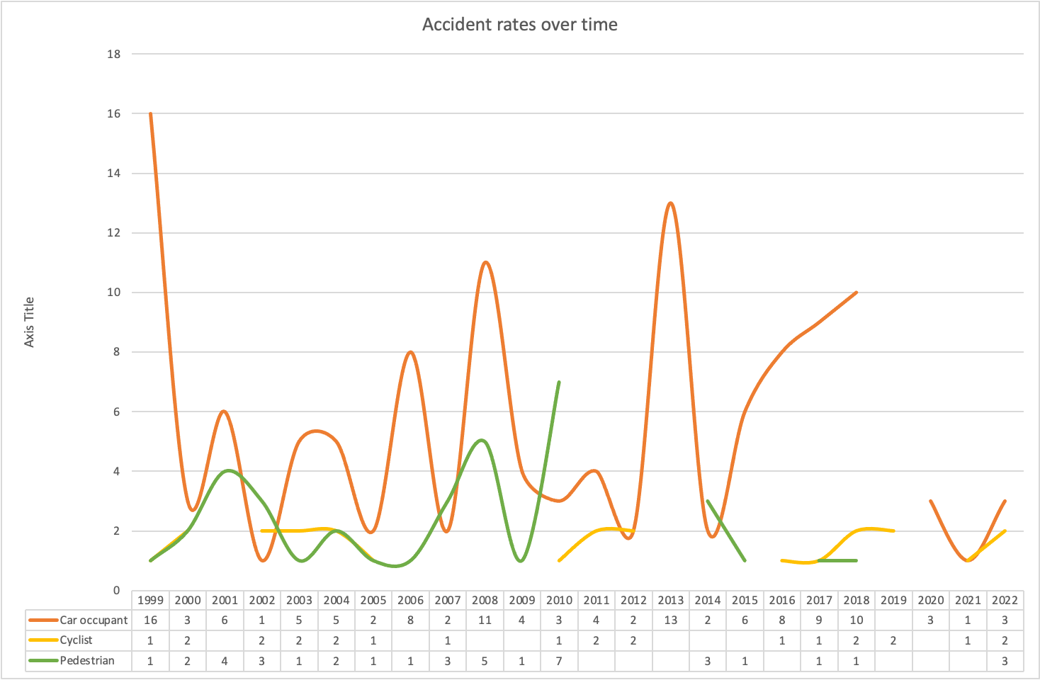 | Year | Car occupant | Cyclist | Pedestrian | Total |